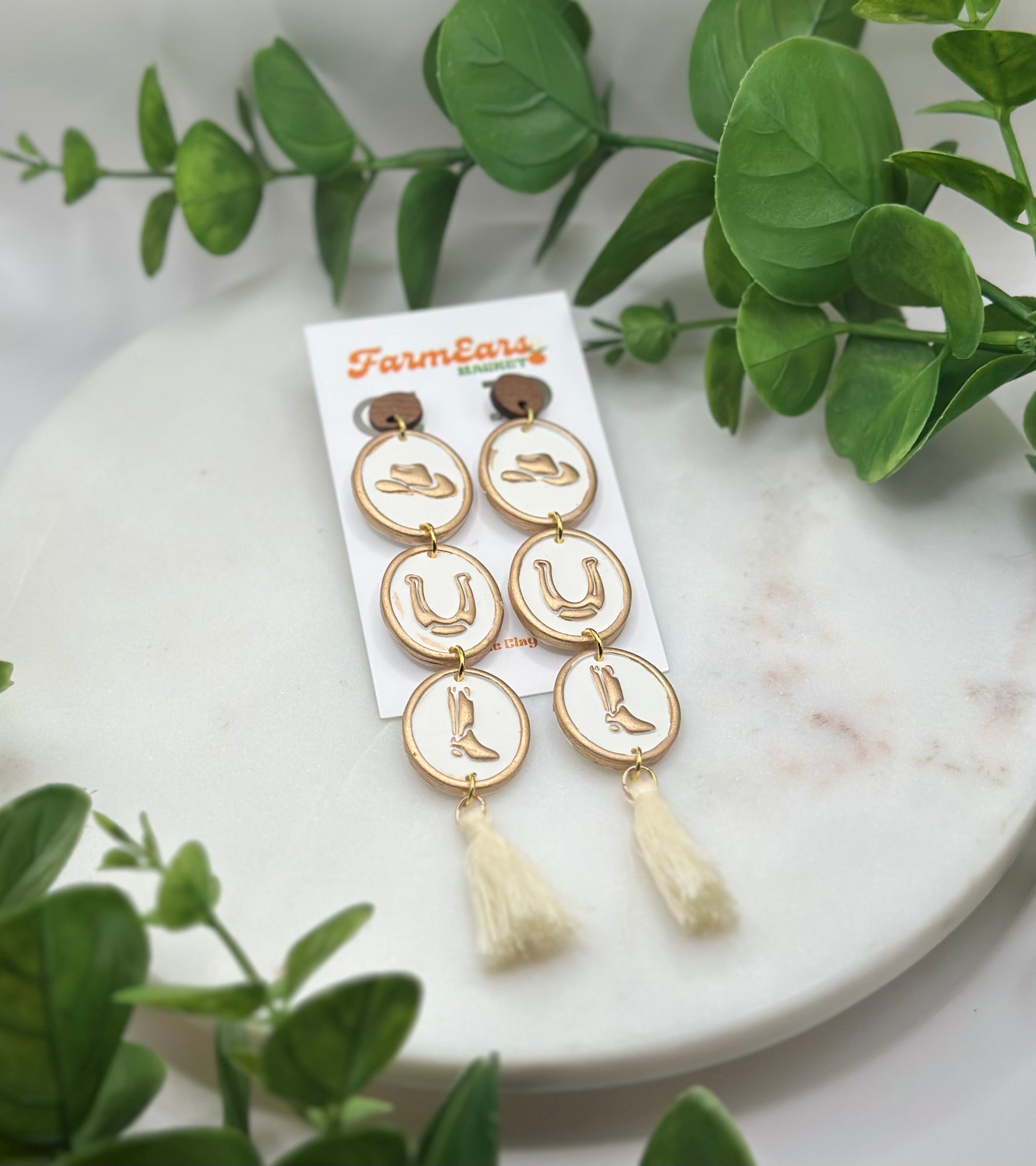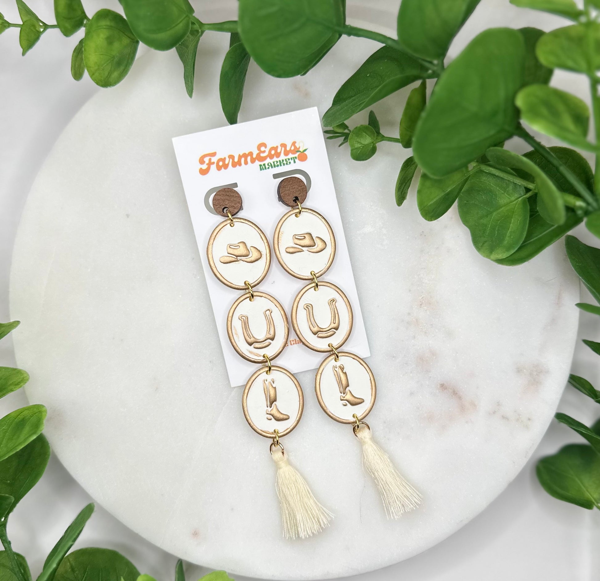 White stacked cowboy charms with a stud drop and tassel finish