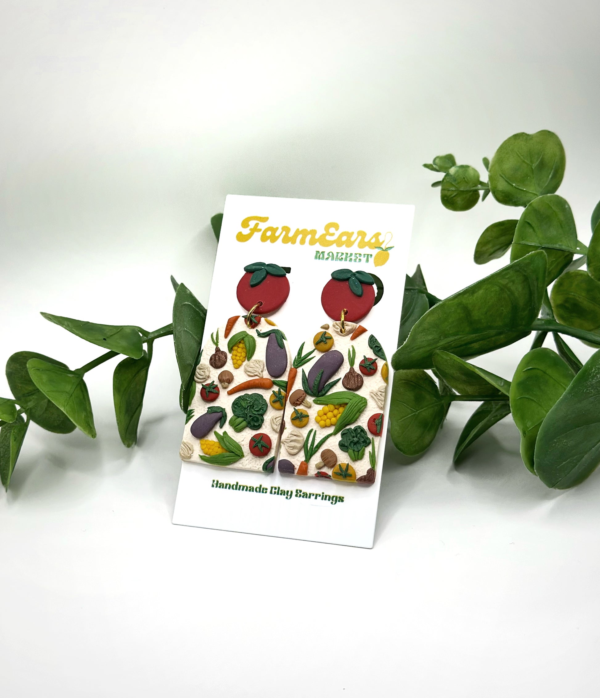 Hand sculpted veggies that dangle from a tomato stud - sealed with resin